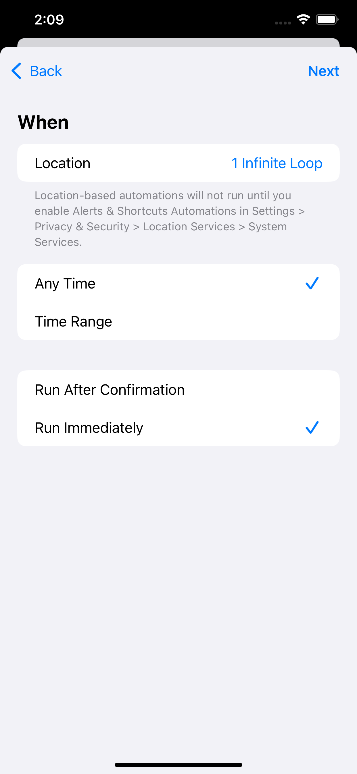Turn on Run Immediately so it runs without asking, then tap Next.