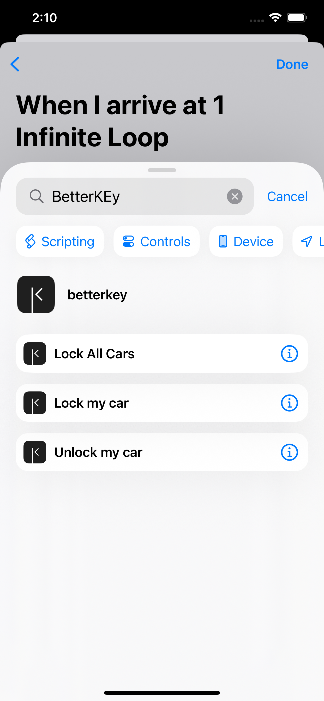 Add another action, search for BetterKey, then choose Lock my car.