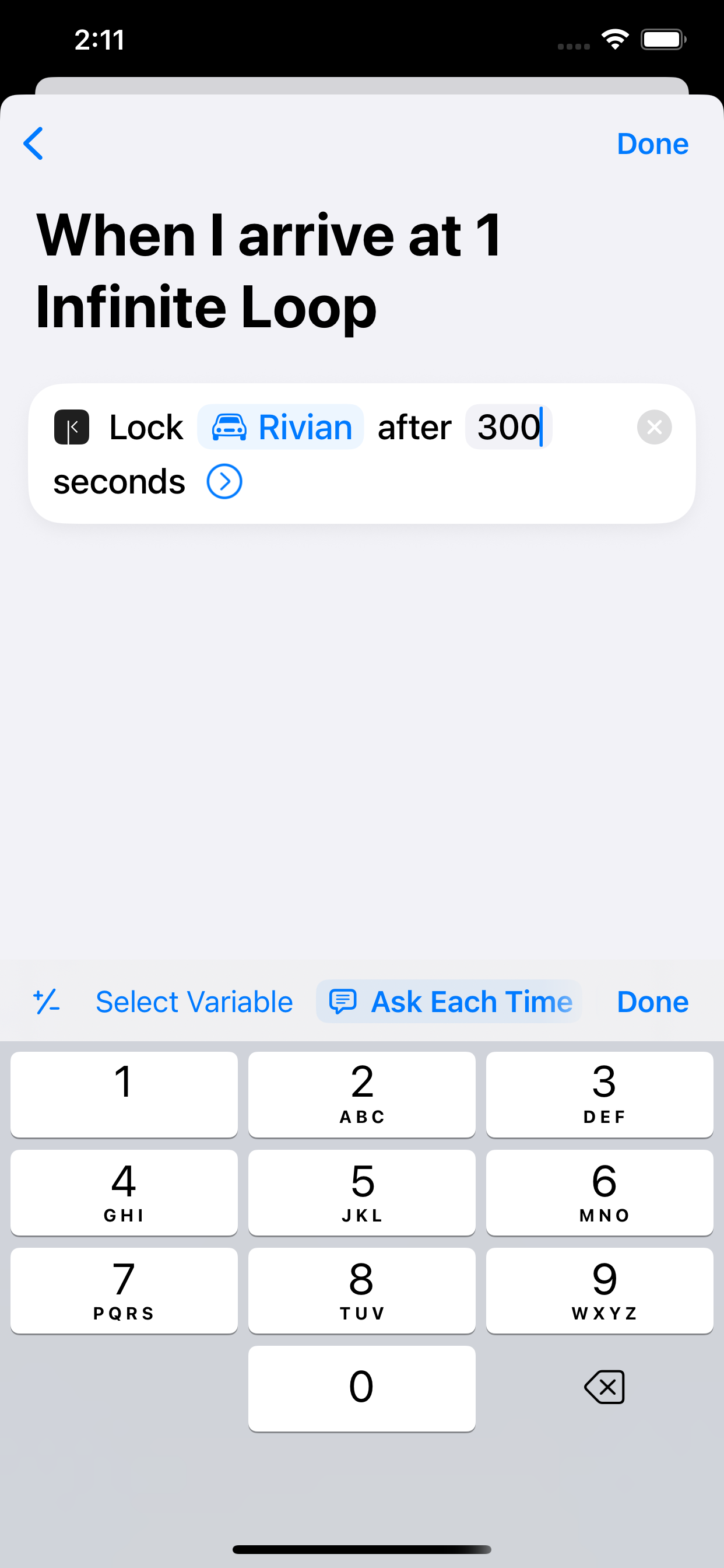 Set how long to wait (for example, 5 minutes) so your car locks shortly after you arrive.